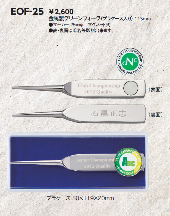 金属製グリーンフォーク直径24mmオリジナルプリントエポマークマーカーマグネット式 表面・裏面に氏名等を彫刻プラケース入り・完全データ要・納期約2週間