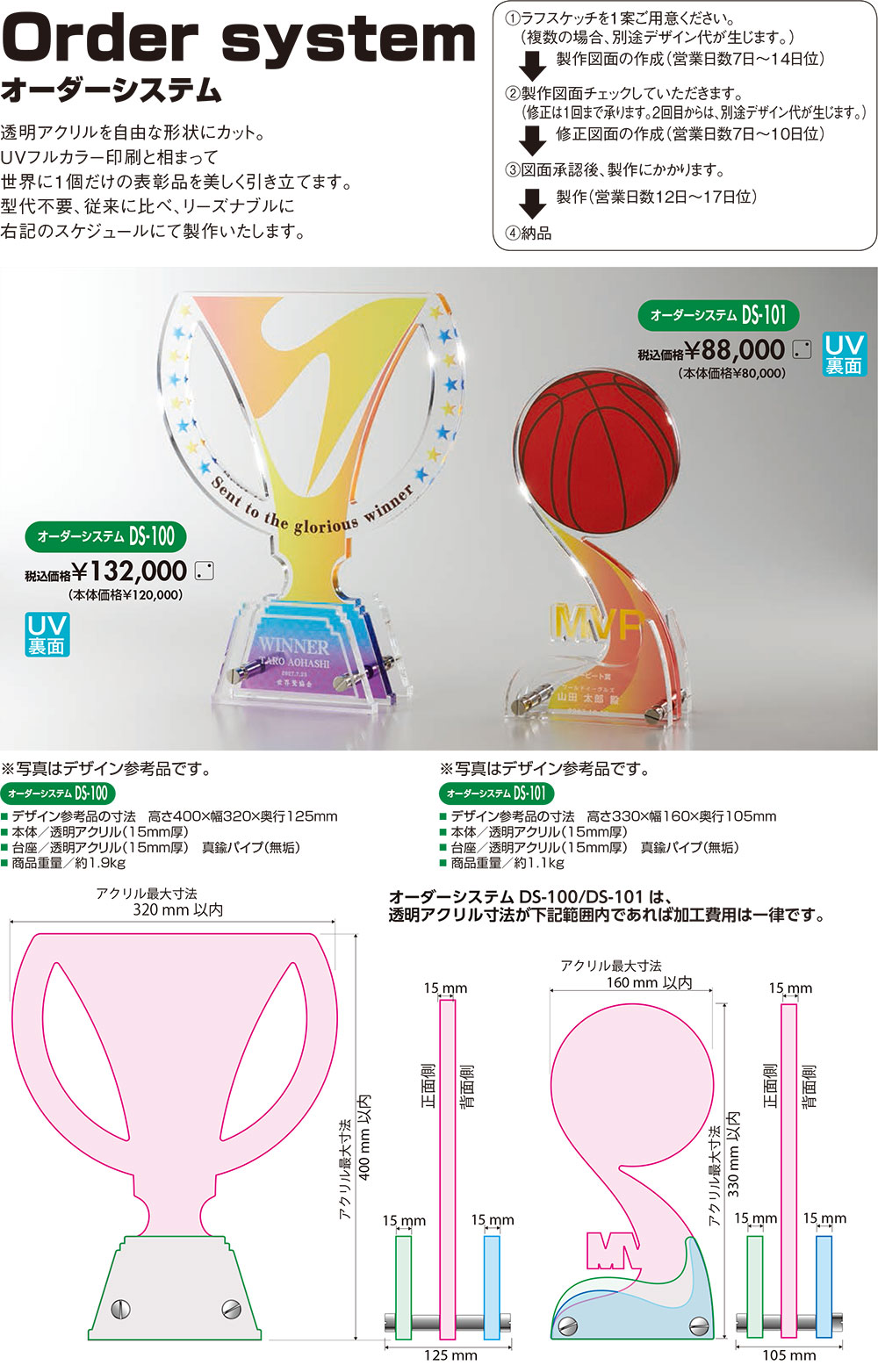 本体/透明アクリル製(15mm厚)台座/透明アクリル(15mm厚)真鍮製パイプアクリルにUV印刷加工・レーザーカット加工デザイン校正OK後約3週間データをメールにて入稿して下さい