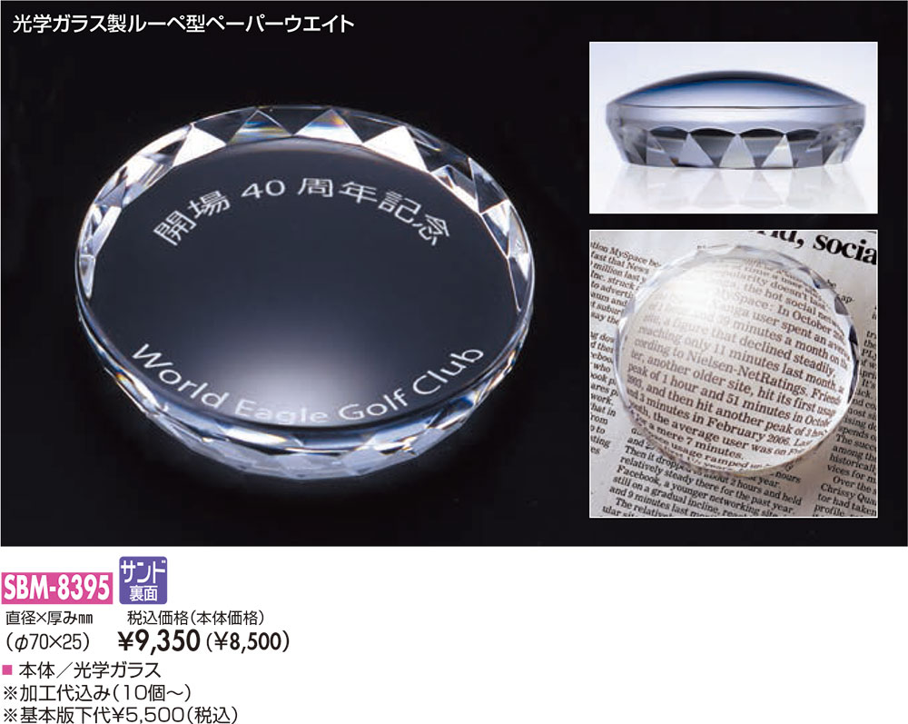本体/光学ガラス製ルーペ型ペーパーウェイト裏面にサンドブラスト加工・納期約10日間