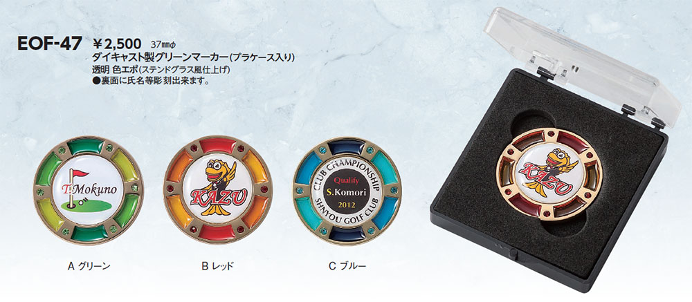 ダイキャスト製グリーンマーカー透明色エポ(ステンドグラス風仕上げ)完全データ要・納期約2週間・裏面に氏名を彫刻プラケース入り