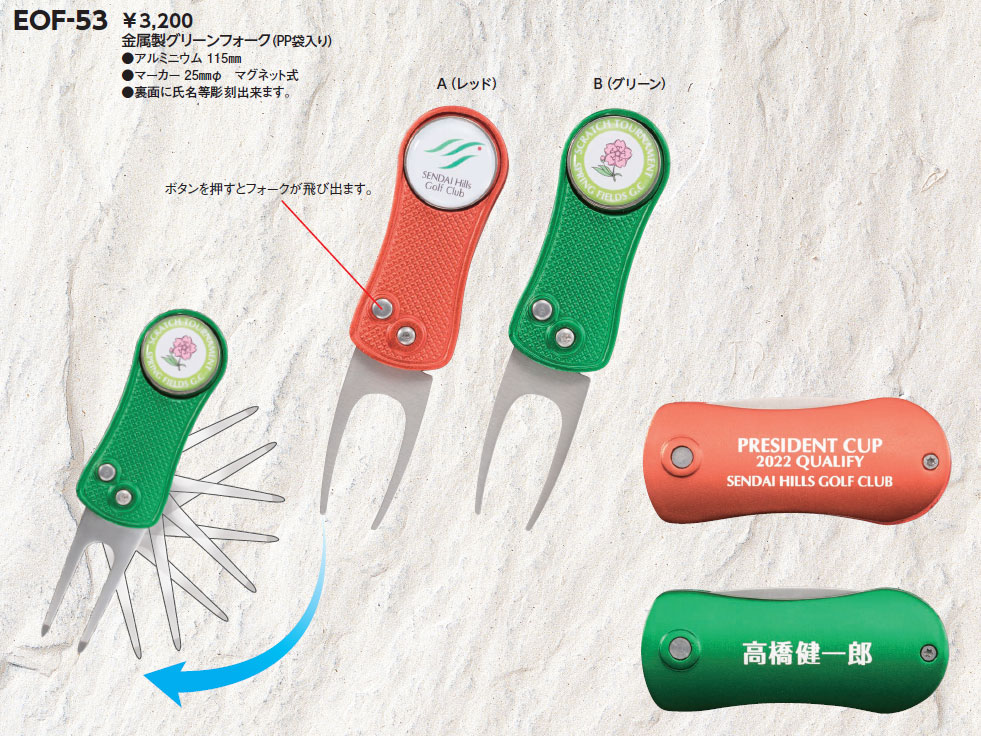 金属製グリーンフォークオリジナルプリントエポマーク付完全データ要・納期約2週間・裏面に氏名を彫刻マーカー直径25mm・マグネット式軟質ビニールケース入り